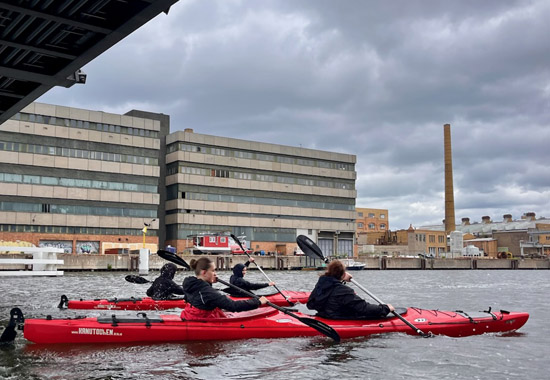 Nach kurzer Einweisung durch Paddelprofi Rene Hartwig wurden die 10 Doppelkajaks zu Wasser gelassen. Entlang der Spree ging es zunächst vorbei an der Insel der Jugend und dem Funkhaus Berlin in Richtung Südosten. Bei perfektem Paddelwetter mussten sich einige Boote erst mit der Steuerung vertraut machen und sorgten für Schweißperlen auf der Stirn von so manchem Kapitän großer Touristenboote. Später erreichten alle wohlauf das Ziel in Berlin Köpenick.
